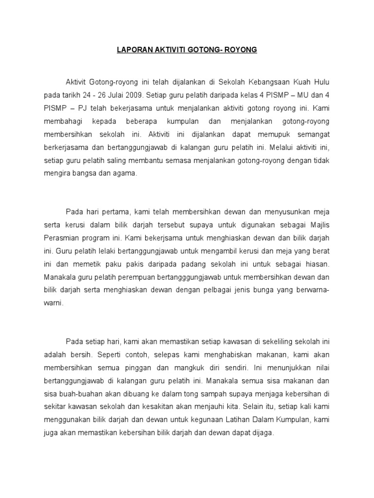 Istilah gotong royong berasal dari bahasa jawa. The known saying equal to gotong royong is berat sama dipikul, ringan sama dijinjing (loosely translated as. Seramai 20 orang datang melibatkan diri secara sukarela membersihkan tempat kediaman mereka. Aktiviti ini merupakan satu langkah untuk menceriakan sekolah disamping merapatkan hubungan. Mengapa mengangkat issue gotong royong ?